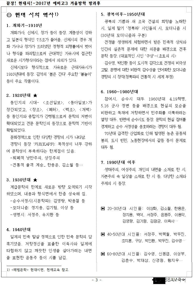 다음은 각 시대별 특징과 시인에 대해 언급한 방과후 교재(직접 제작)를 참고로 올려보니, 현대시 공부에 도움이 되기 바랍니다.