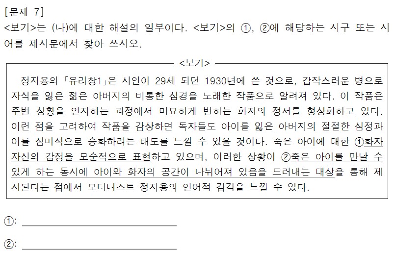 [문제 6]부터 문학 영역 시작. (가)는 '월명사'의 <제망매가>, (나)는 '정지용'의 <유리창1>. 작품이 어렵지 않고 고3이라면 무조건 공부해야 할 대표 작품들이기때문에, 어렵지 않게 풀 수 있는 문제.