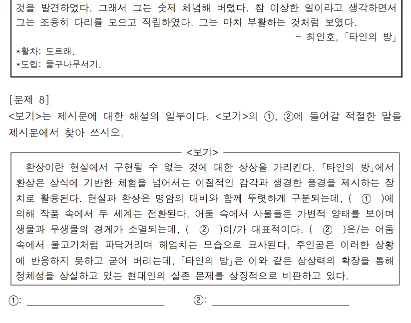 현대 소설 '최인호'의 <타인의 방>을 제시문으로 읽고, <보기>의 해석에 해당하는 말을 제시문에서 찾아 쓰는 문제.