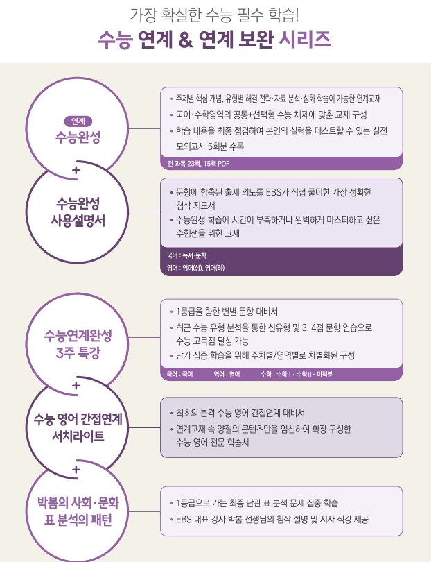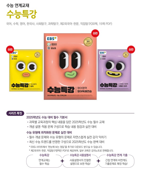 국어, 수학, 사탐, 과탐, 영어 각각 과목당 모두 연계 교재인 [수능특강]이 출시됩니다. 말 그대로 수능 문제와 연계되는 교재라는 의미입니다. 2월 초 쯤에 연계 교재 [수능 특강]이 출간되고, 6월 즈음엔 [수능 완성]이 출간 됩니다.