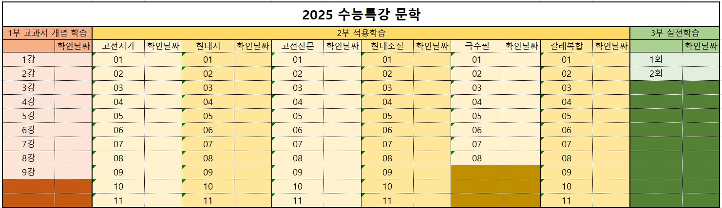 때문에 계획을 세우고, 문학 어디까지 풀어 나갔는지 체크하면서 보면 얼만큼 했는지 그리고 얼만큼 남았는지 가늠할 수 있어 공부력을 꾸준히 유지할 수 있습니다.