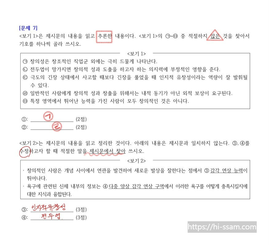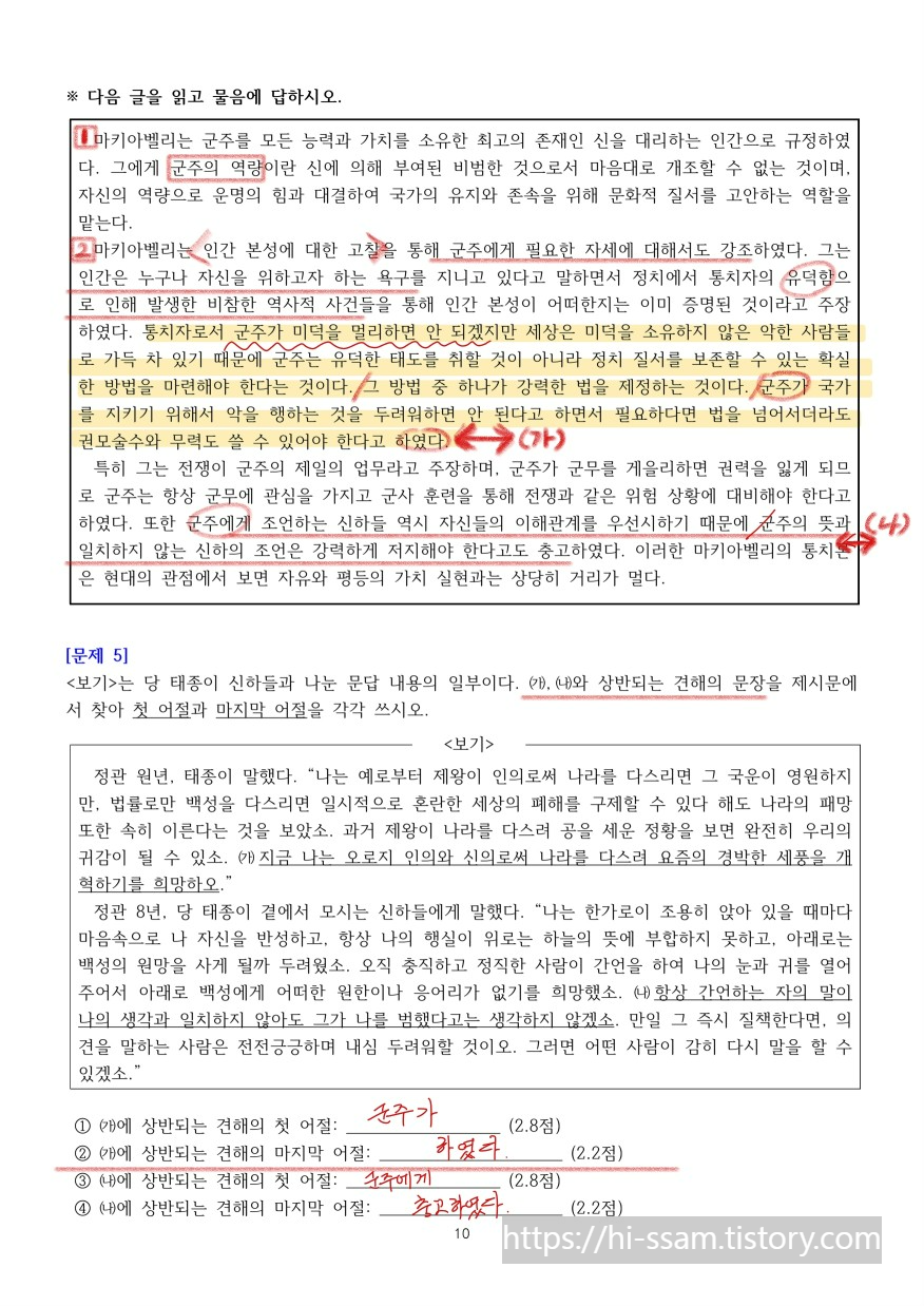 위 문제 ③, 댓글로 문의 주셔서 늦었지만 추가로 더 정정해야할 것 같습니다. 내용 파악을 중심으로 하다보니 핵심 문장 시작부터 적었는데, 문제 조건에서, 문장을 찾아 첫어절을 쓰라고 했으니 '또한'이 더 정확할 것 같습니다. 그렇다고 '군주에게'부터 시작한다고 하여도 '문장'이 아니라고 할 수 없고, '또한'부터 시작해도 문장이 아니라고 할 수 없어서, 채점자가 판단하거나 조건이 더 자세히 붙지 않을까 하는 생각이 듭니다.
